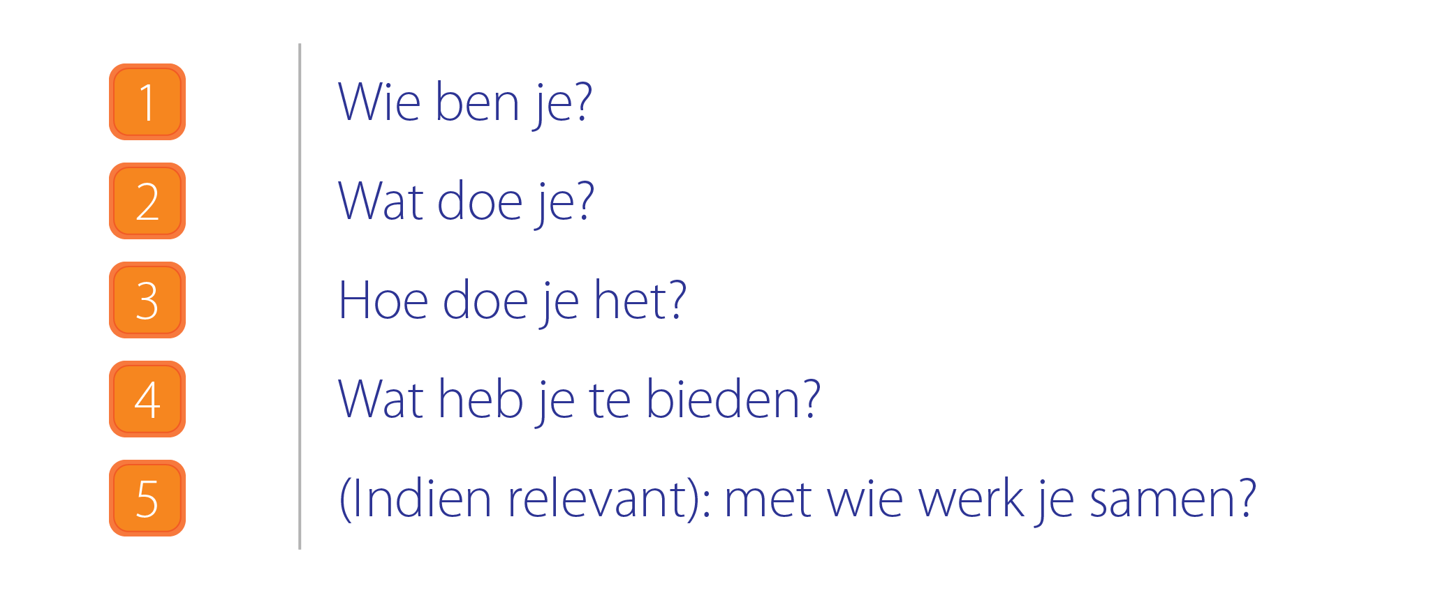 Om de modules op te bouwen bedenk je een paar goede zinnen bij alle onderwerpen die in je elevator pitch van belang kunnen zijn. Ook verzamel je verschillende openingszinnen en manieren om af te sluiten. Onderwerpen die je in ieder geval moet voorbereiden zijn: